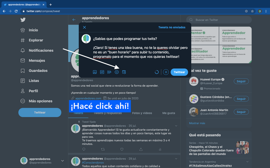 ¡Programá tus twits! Equipo de Apprendedores5 ago 20201 Min. de lecturaSi sos usuario de Twitter, este aprendizaje es para vos! Y si todavía no nos seguis en twitter, ¿Qué estás esperando? https://twitter.com/apprendedores